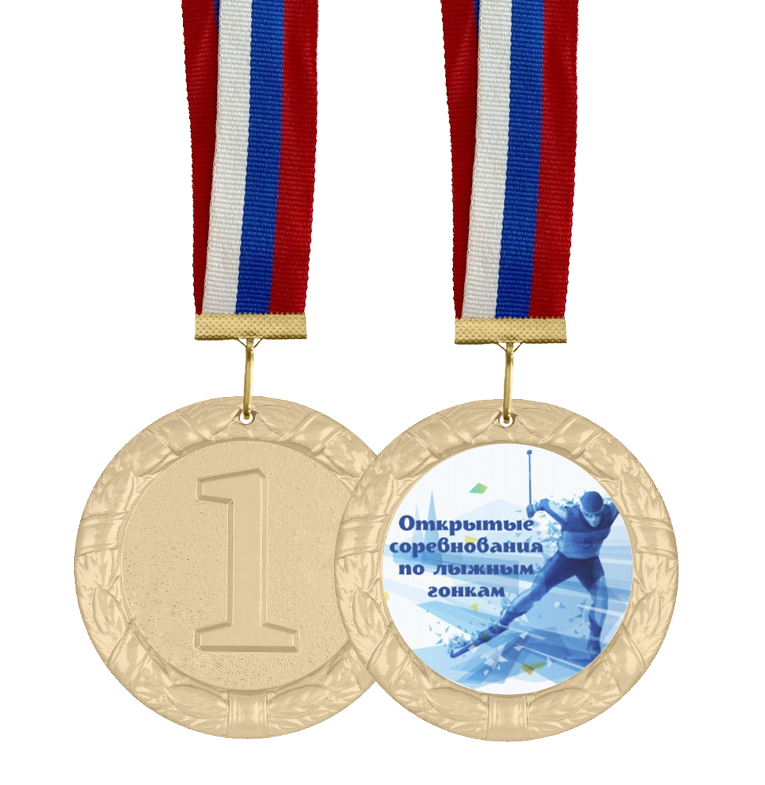 Объемная медаль - для лыжников Ф 70 мм. с лентой и вкладышем. С блестящим покрытием в цвет - золото, серебро и бронза.