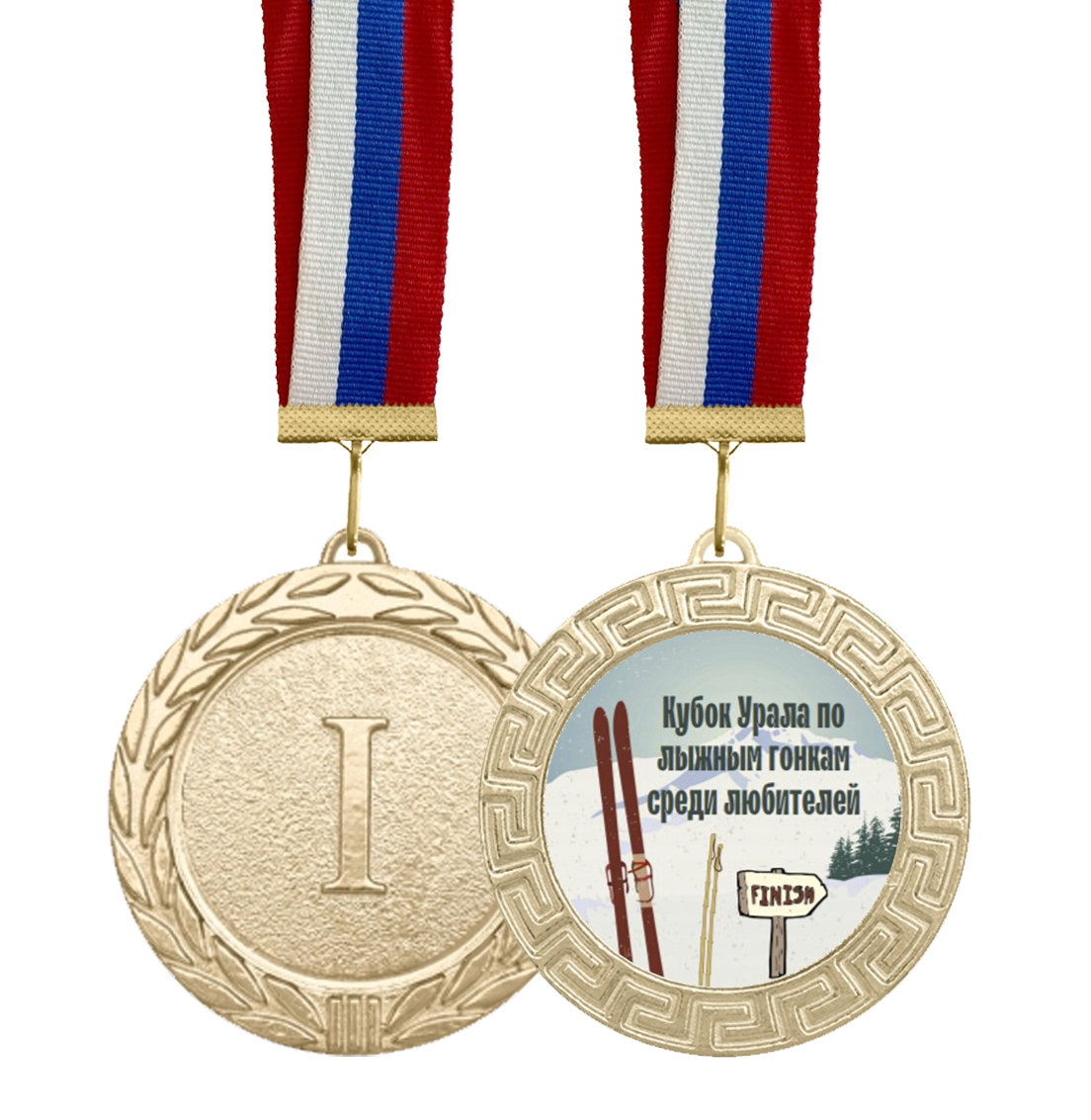 Объемная медаль - для лыжников Ф 70 мм. с лентой и вкладышем. С блестящим покрытием в цвет - золото, серебро и бронза.
