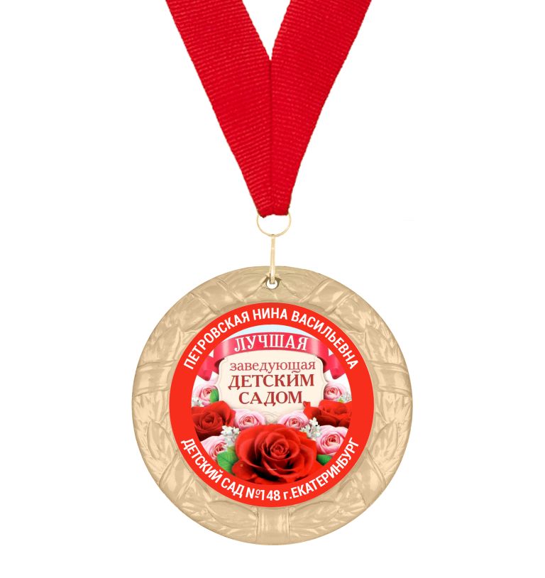 Медаль для заведующей детским садом диаметром 70мм, по настоящему достойная медаль для вручения! Высокий рельеф, красивый золотой цвет она приведет в восторг любого! Эта медаль уникальная, она полностью разработана и отлита в России на нашем предприятии, это - единственная в стране медаль, выпуклая с обеих сторон, материал медали цинковый сплав с покрытием цветными металлами. Изображение внутри медали наносится на металлический алюминиевый шильдик белого цвета, что гарантирует красивые и яркие цвета, лента из атласного материала.