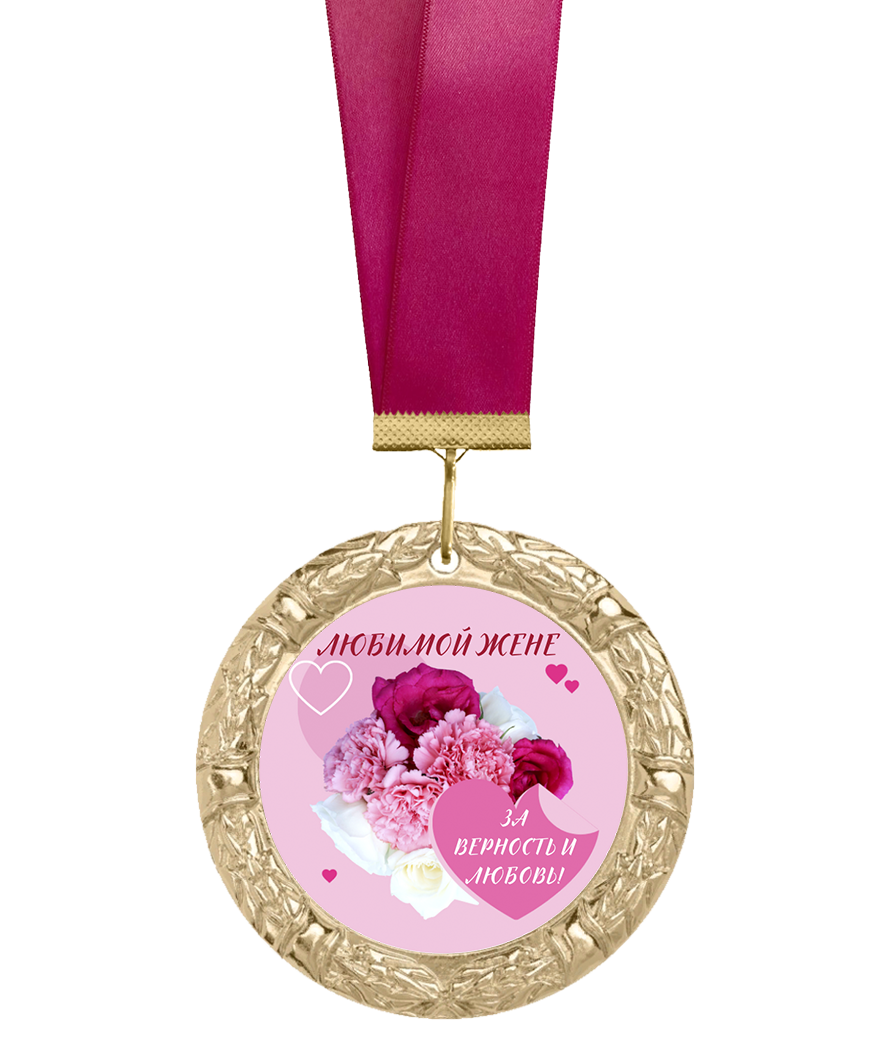 Медаль для жены диаметром 70мм, по настоящему достойная медаль для вручения! Высокий рельеф, красивый золотой цвет, по настоящему тяжелая она подарит незабываемые ощущения! Эта медаль уникальная, она полностью разработана и отлита в России на нашем предприятии, материал медали цинковый сплав с покрытием цветными металлами. Изображение внутри медали наносится на металлический алюминиевый шильдик, что гарантирует красивые и яркие цвета, лента из качественного и мягкого полиэфирного волокна.