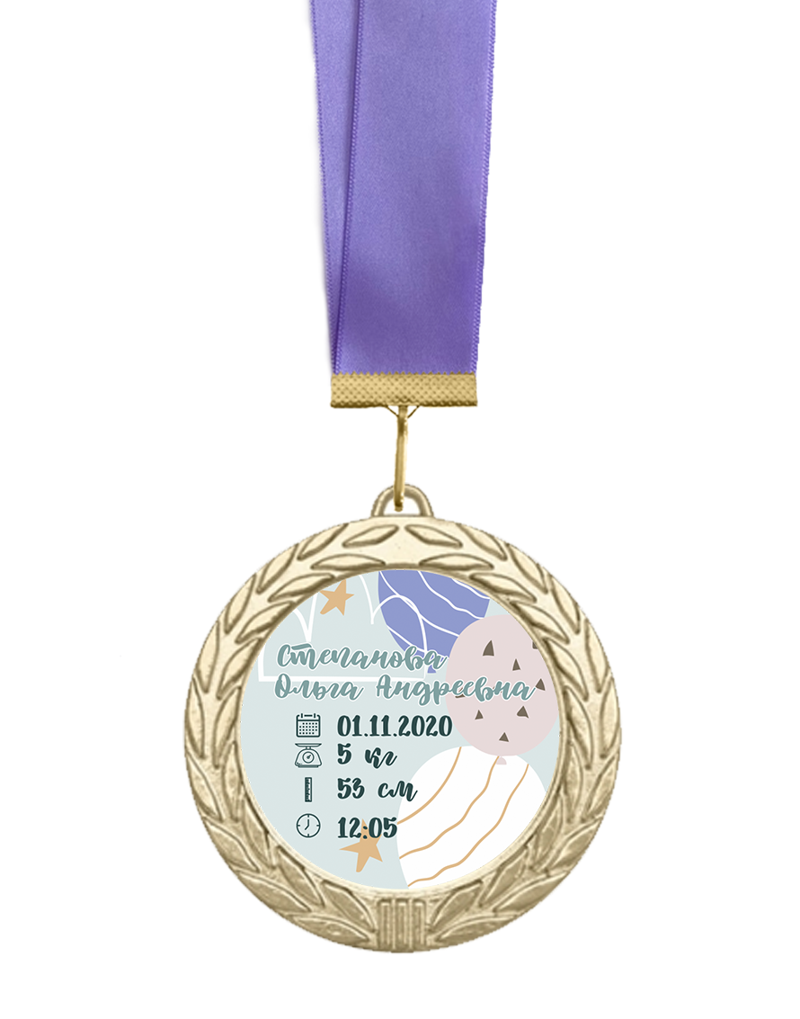Медаль новорожденному диаметром 70мм, по настоящему достойная медаль для вручения! Высокий рельеф, красивый золотой цвет она приведет в восторг любого ребенка! Эта медаль уникальная, она полностью разработана и отлита в России на нашем предприятии, материал медали цинковый сплав с покрытием цветными металлами. Изображение внутри медали наносится на металлический алюминиевый шильдик, что гарантирует красивые и яркие цвета, лента из качественного и мягкого полиэфирного волокна.