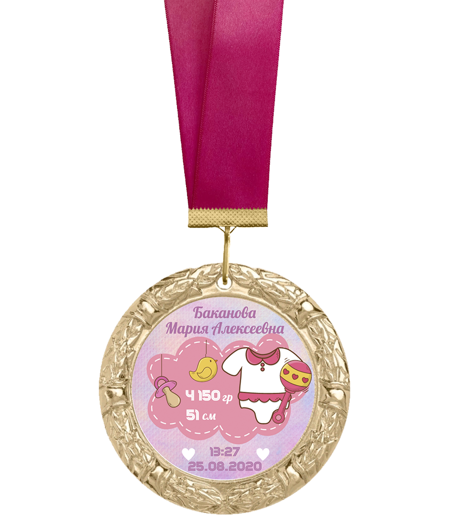 Медаль новорожденному диаметром 70мм, по настоящему достойная медаль для вручения! Высокий рельеф, красивый золотой цвет она приведет в восторг любого ребенка! Эта медаль уникальная, она полностью разработана и отлита в России на нашем предприятии, материал медали цинковый сплав с покрытием цветными металлами. Изображение внутри медали наносится на металлический алюминиевый шильдик, что гарантирует красивые и яркие цвета, лента из качественного и мягкого полиэфирного волокна.