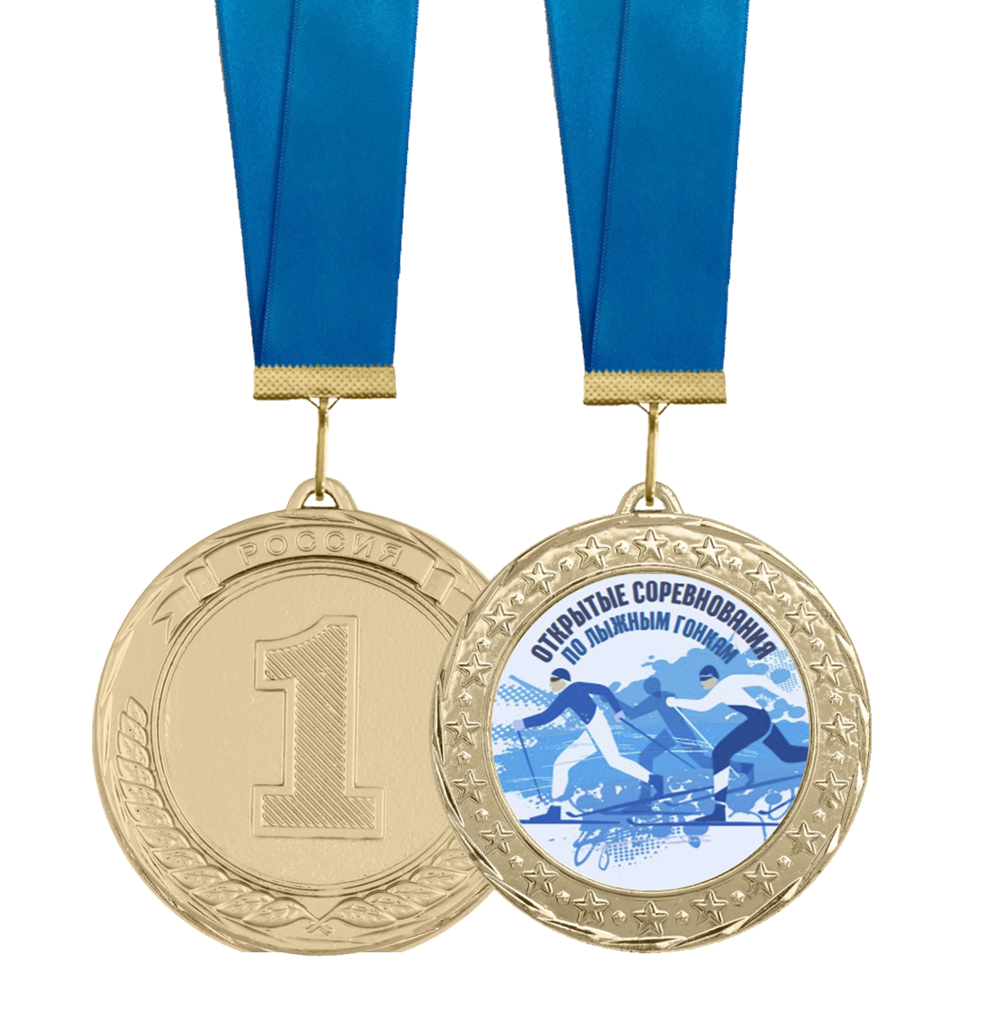 Объемная медаль - для лыжников Ф 70 мм. с лентой и вкладышем. С блестящим покрытием в цвет - золото, серебро и бронза.