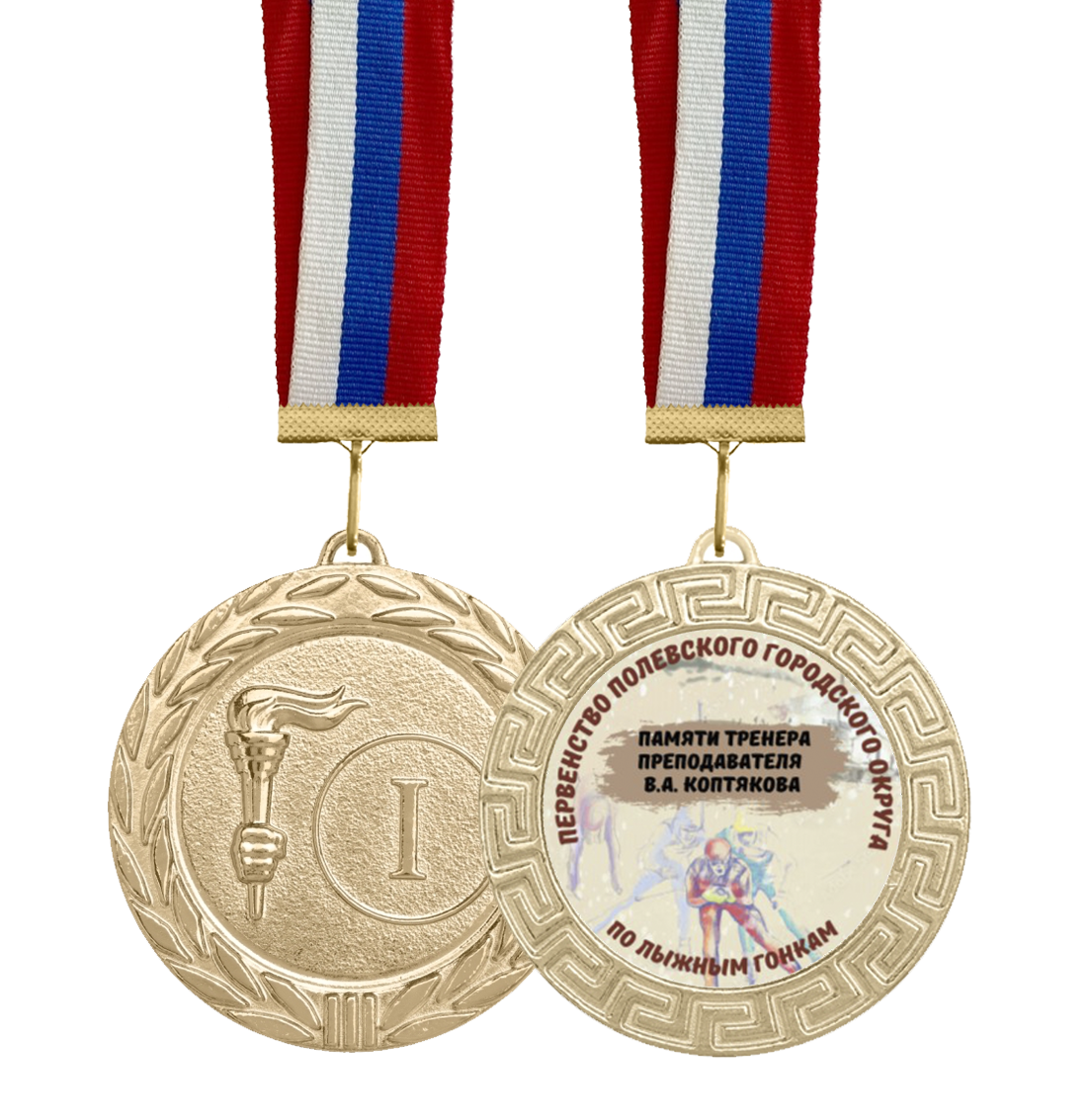 Объемная медаль - для лыжников Ф 70 мм. с лентой и вкладышем. С блестящим покрытием в цвет - золото, серебро и бронза.