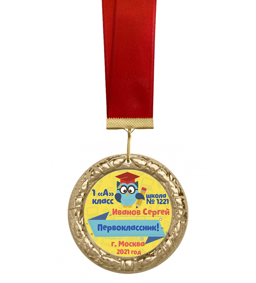 Медаль для первоклассника диаметром 50мм, по настоящему достойная медаль для вручения за начало учебы в первом классе! Высокий рельеф, красивый золотой цвет она приведет в восторг любого ребенка! Эта медаль уникальная, она полностью разработана и отлита в России на нашем предприятии, материал медали цинковый сплав с покрытием цветными металлами. Изображение внутри медали наносится на металлический алюминиевый шильдик, что гарантирует красивые и яркие цвета, лента из качественного и мягкого полиэфирного волокна.