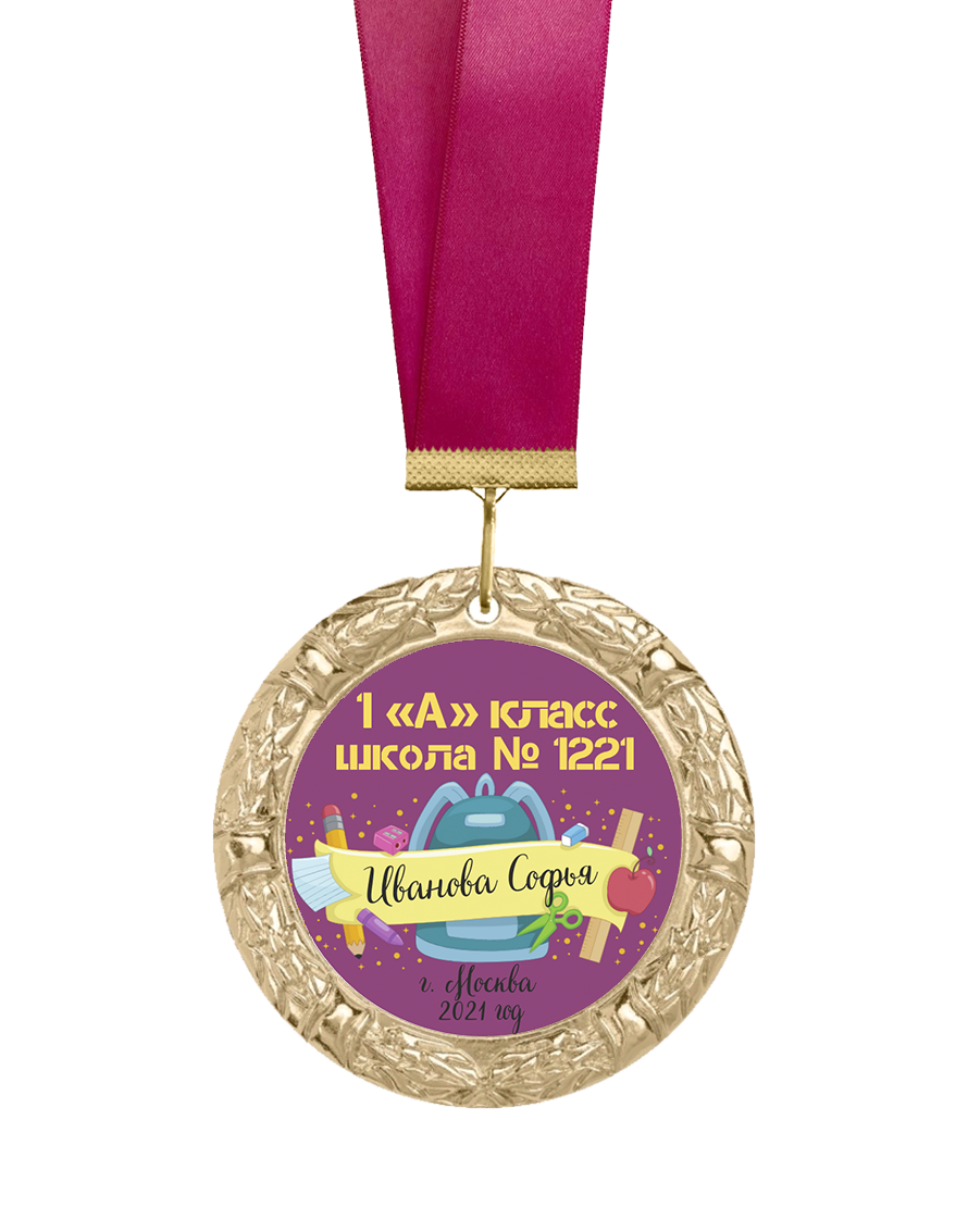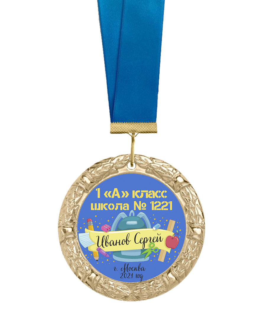 Медаль для первоклассника диаметром 70мм, по настоящему достойная медаль для вручения за начало учебы в первом классе! Высокий рельеф, красивый золотой цвет она приведет в восторг любого ребенка! Эта медаль уникальная, она полностью разработана и отлита в России на нашем предприятии, материал медали цинковый сплав с покрытием цветными металлами. Изображение внутри медали наносится на металлический алюминиевый шильдик, что гарантирует красивые и яркие цвета, лента из качественного и мягкого полиэфирного волокна.