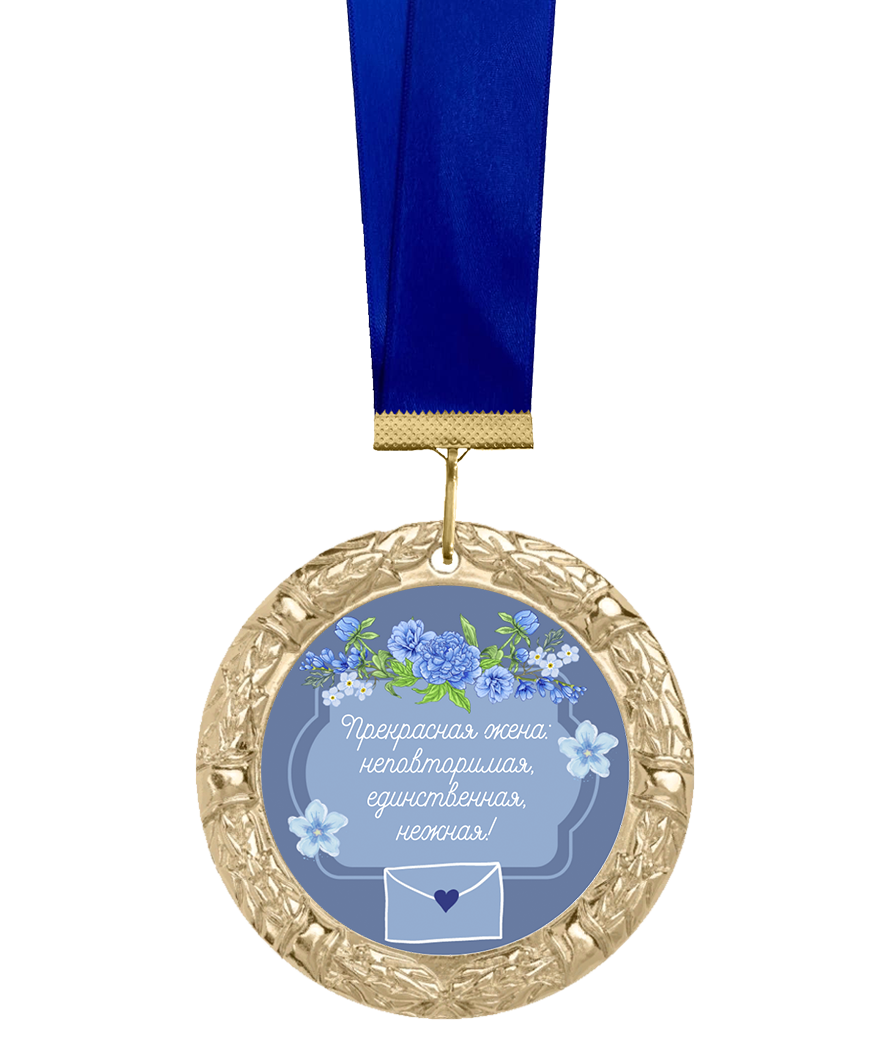 Медаль для жены диаметром 70мм, по настоящему достойная медаль для вручения! Высокий рельеф, красивый золотой цвет, по настоящему тяжелая она подарит незабываемые ощущения! Эта медаль уникальная, она полностью разработана и отлита в России на нашем предприятии, материал медали цинковый сплав с покрытием цветными металлами. Изображение внутри медали наносится на металлический алюминиевый шильдик, что гарантирует красивые и яркие цвета, лента из качественного и мягкого полиэфирного волокна.