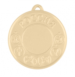 Круглая медаль диаметром 50 мм оригинального спортивного дизайна. На лицевой стороне по кругу расположены:сверху- надпись Россия, а далее-основные символы наград(Георгий Победоносец, кубок, места победного пьедестала 1-2-3, Ника, герб России). По центру расположено место под шильдик диаметром 25 мм. С обратной стороны изображений нет, имеется место под шильдик диаметром 40 мм. Прекрасно подходит для вручения участникам массовых спортивных соревнований и не только.