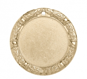 Круглая медаль диаметром 70 мм классического универсального дизайна. На лицевой стороне по контуру расположен объемный лавровый венок. По центру находится место под шильдик диаметром 50 мм. С обратной стороны изображения отсутствуют, в центре находится место под шильдик диаметром 50 мм. Универсально подходит для любых видов награждений.