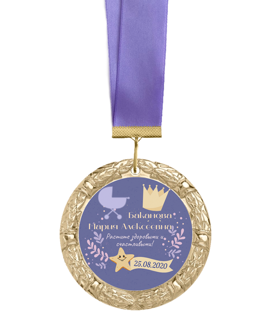 Медаль новорожденному диаметром 70мм, по настоящему достойная медаль для вручения! Высокий рельеф, красивый золотой цвет она приведет в восторг любого ребенка! Эта медаль уникальная, она полностью разработана и отлита в России на нашем предприятии, материал медали цинковый сплав с покрытием цветными металлами. Изображение внутри медали наносится на металлический алюминиевый шильдик, что гарантирует красивые и яркие цвета, лента из качественного и мягкого полиэфирного волокна.