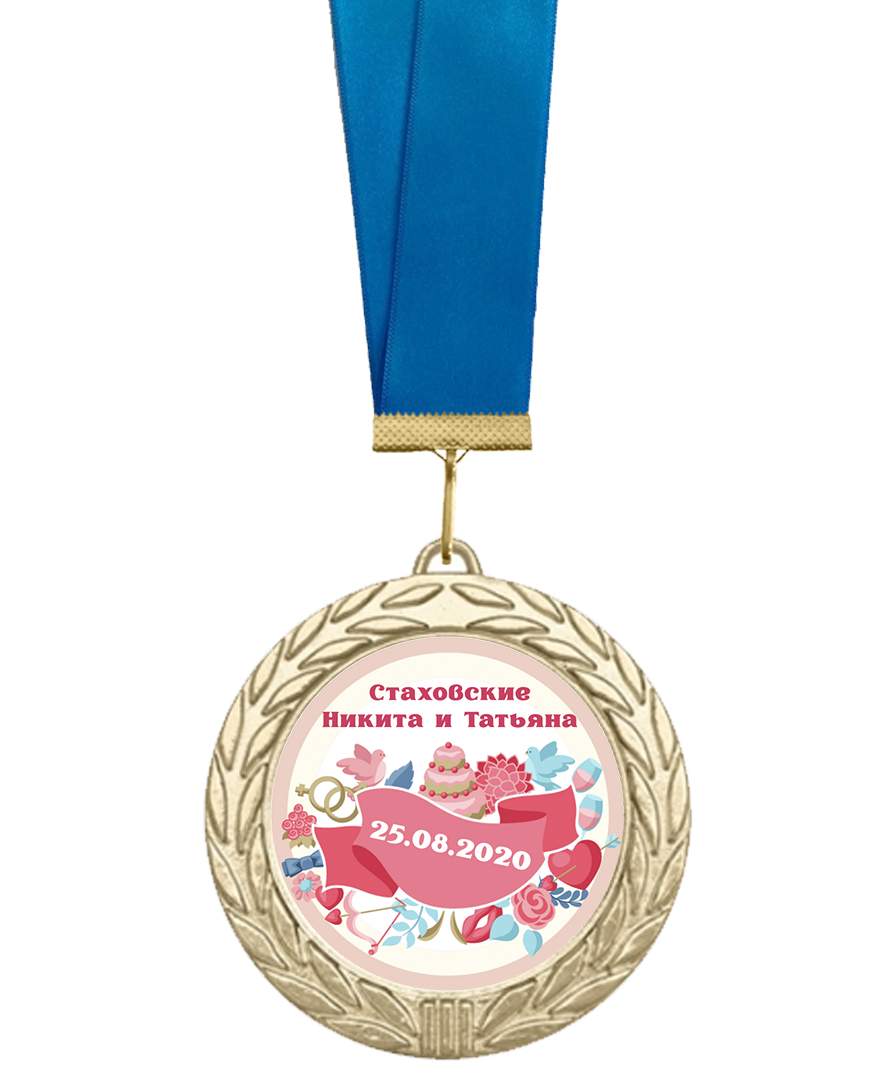 Медаль молодоженам диаметром 70мм, по настоящему достойная медаль для вручения! Высокий рельеф, красивый золотой цвет она приведет в восторг любого! Эта медаль уникальная, она полностью разработана и отлита в России на нашем предприятии, материал медали цинковый сплав с покрытием цветными металлами. Изображение внутри медали наносится на металлический алюминиевый шильдик, что гарантирует красивые и яркие цвета, лента из качественного и мягкого полиэфирного волокна.