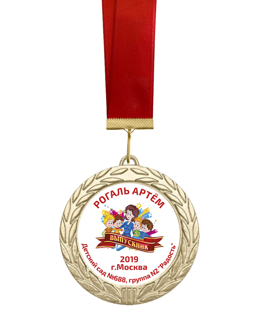 Медаль для Выпускника детского сада диаметром 70мм, по настоящему достойная медаль для вручения! Высокий рельеф, красивый золотой цвет она приведет в восторг любого ребенка! Эта медаль уникальная, она полностью разработана и отлита в России на нашем предприятии, материал медали цинковый сплав с покрытием цветными металлами. Изображение внутри медали наносится на металлический алюминиевый шильдик, что гарантирует красивые и яркие цвета, лента из качественного и мягкого полиэфирного волокна красного цвета.