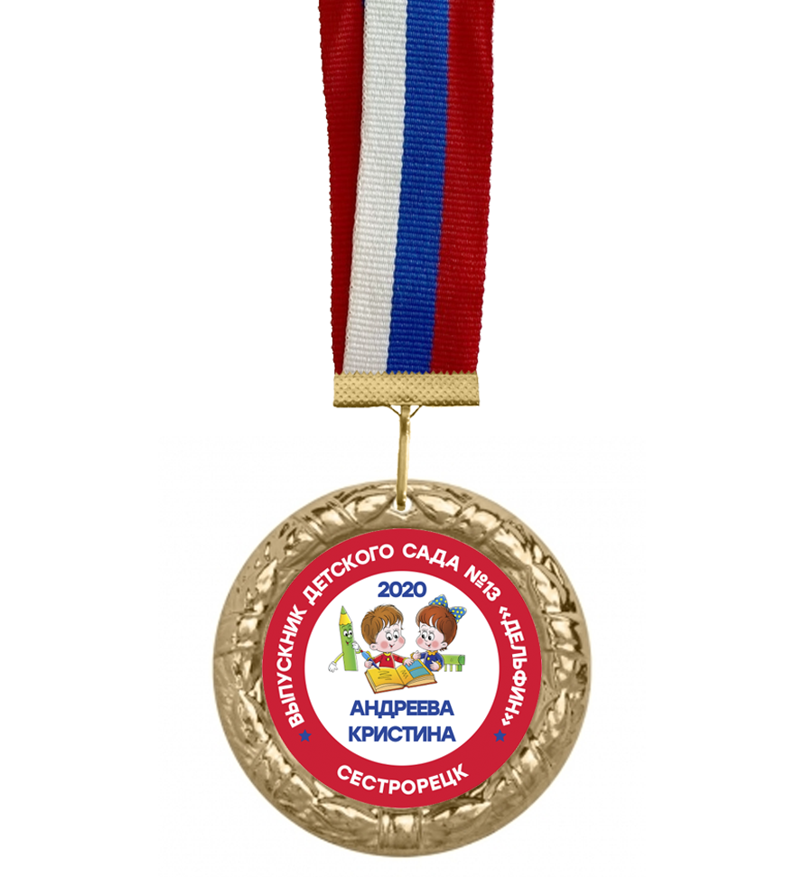 Медаль для Выпускника детского сада диаметром 50мм, по-настоящему достойная медаль для вручения! Высокий рельеф, красивый золотой цвет- она приведет в восторг любого ребенка! Эта медаль уникальная, она полностью разработана и отлита в России на нашем предприятии, материал медали цинковый сплав с покрытием цветными металлами. Изображение внутри медали наносится на металлический алюминиевый шильдик, что гарантирует красивые и яркие цвета, лента из качественного и мягкого полиэфирного волокна.