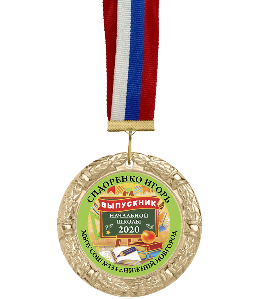 Медаль для выпускника начальной школы диаметром 70мм, по настоящему достойная медаль для вручения! Высокий рельеф, красивый золотой цвет она приведет в восторг любого ребенка! Эта медаль уникальная, окантовка в виде древнегреческого венка, она полностью разработана и отлита в России на нашем предприятии, материал медали цинковый сплав с покрытием цветными металлами. Изображение внутри медали наносится на металлический алюминиевый шильдик, что гарантирует красивые и яркие цвета, лента из качественного и мягкого полиэфирного волокна.