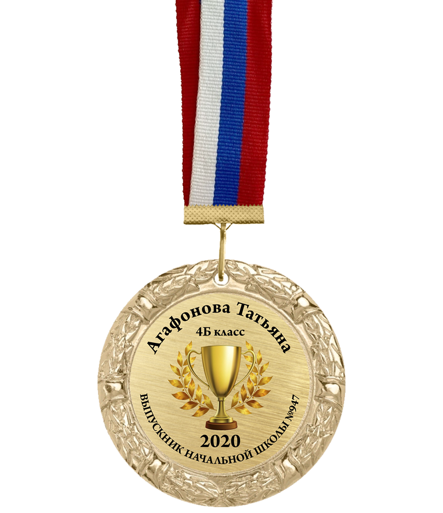 Медаль для выпускника начальной школы диаметром 70мм, по настоящему достойная медаль для вручения! Высокий рельеф, красивый золотой цвет она приведет в восторг любого ребенка! Эта медаль уникальная, окантовка в виде древнегреческого венка, она полностью разработана и отлита в России на нашем предприятии, материал медали цинковый сплав с покрытием цветными металлами. Изображение внутри медали наносится на металлический алюминиевый шильдик, что гарантирует красивые и яркие цвета, лента из качественного и мягкого полиэфирного волокна.