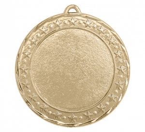 Круглая универсальная медаль диаметром 70 мм оригинального дизайна. На лицевой стороне по кругу расположены сверху-флаг с надписью Россия, снизу-лавровый венок. По центру находится объемное изображение кубка. С обратной стороны по окружности находится широкое поле с изображением больших и малых звезд, в центре находится место под шильдик диаметром 50 мм. Идеально подходит для награждения чемпионов и победителей.